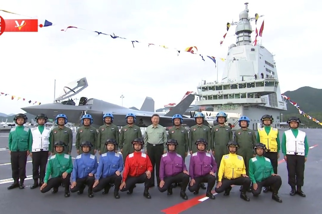 我国第一艘电磁弹射型航空母舰福建舰入列授旗仪式5日在海南三亚某军港举行。中共中央总书记、国家主席、中央军委主席习近平出席入列授旗仪式并登舰视察。